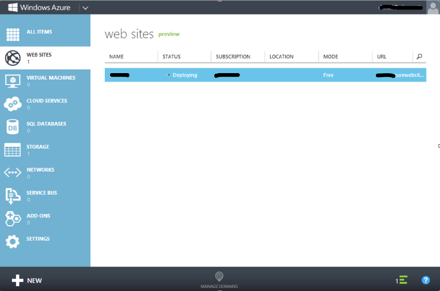 As you can see below, once you log in to the new portal there are many different options. For the purpose of this migration I only needed to use the WEB SITES option. If you want to know how much better the new portal is in comparison to the old one check out my Lap Around the windows azure portal series which covered the old portal in a lot of detail. Also in case you are not aware, you can setup up to 10 websites on Windows Azure for free.